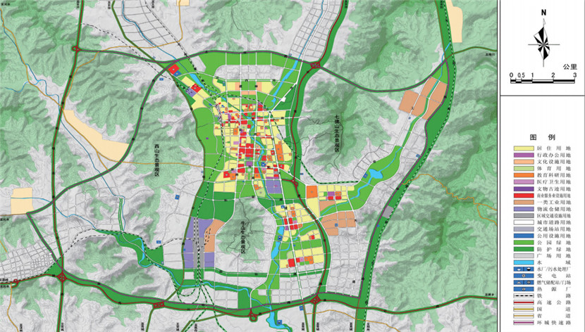 規(guī)劃采取非均衡發(fā)展策略,構(gòu)建圍繞中心城市的“手掌”狀半小時經(jīng)濟圈,中心城區(qū)為“掌心”,交通軸線為“手指”,沿線城鎮(zhèn)和產(chǎn)業(yè)園區(qū)為“關(guān)節(jié)”,打造 1+5 城鎮(zhèn)與產(chǎn)業(yè)集聚區(qū),提高城市核心競爭力,提升區(qū)域協(xié)作水平,確定了“一城三區(qū)”組團空間結(jié)構(gòu),將城市西南片區(qū)及米山片區(qū)納入城市建設(shè)用地范圍,提出了“擁山不占山,營水親近水”的生態(tài)綠地建設(shè)原則,構(gòu)建了“五山相擁、四河相匯”的生態(tài)綠地系統(tǒng),將周邊山體引入城市,將城市河流與大自然相連。